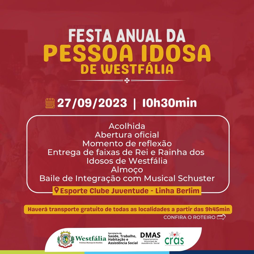 Celebrar com os idosos, em um dia de integração, alegria e amizade, é o objetivo principal da Festa Anual da Pessoa Idosa de Westfália. Nesta edição, a programação, que já é tradicional no Município, acontece nesta quarta-feira, dia 27 de setembro, tendo por local o Esporte Clube Juventude, em Linha Berlim. Haverá transporte nas localidades para munícipes que necessitarem fazer uso do mesmo (conforme roteiro informado abaixo).