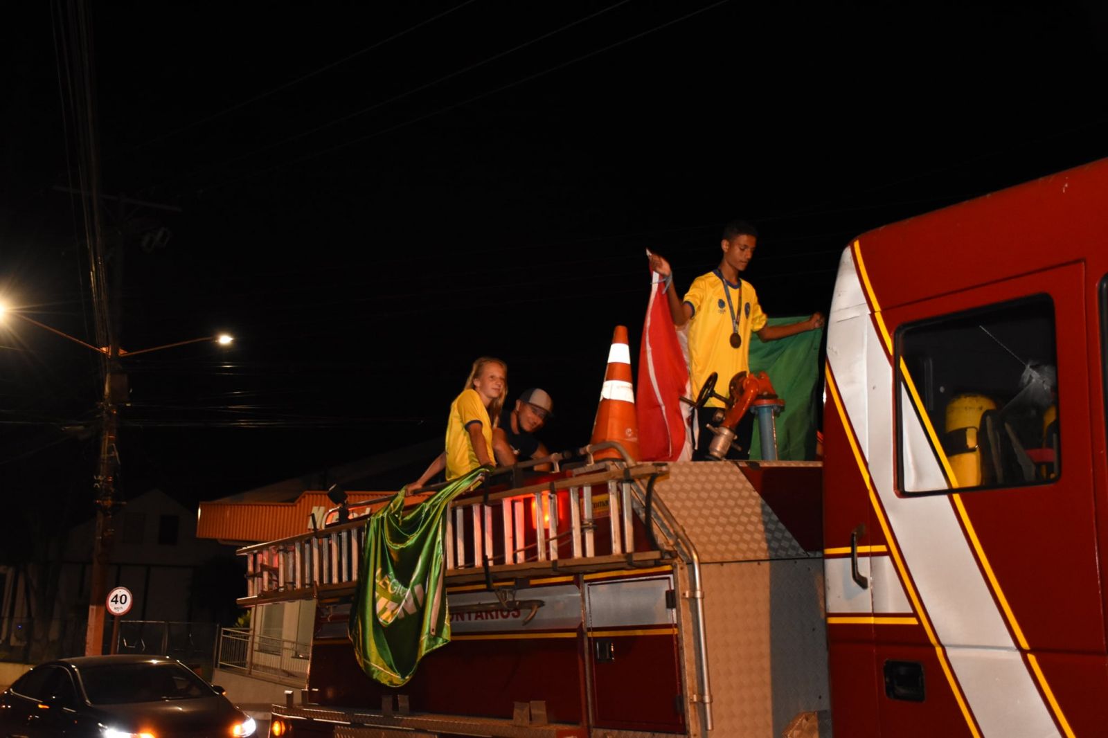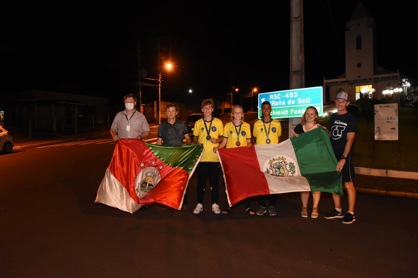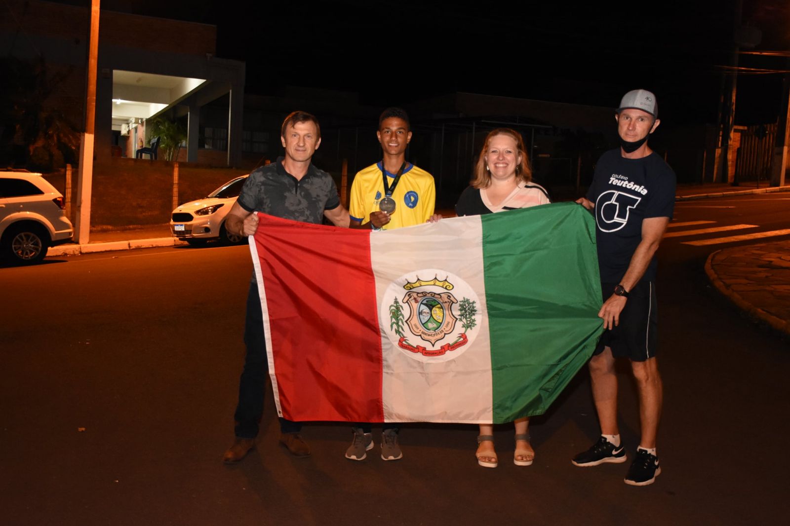 Sobre o caminhão do Corpo de Bombeiros Voluntários, os atletas desfilaram por Teutônia e Westfália, encerrando o trajeto na EMEF Vila Schmidt, onde o prefeito de Westfália, Joacir Antônio Docena, e a diretora do educandário, Viviane Brune, receberam os jovens. A comitiva ainda foi acompanhada pelo diretor do Colégio Teutônia, Jonas Rückert, e pelo professor e treinador Laudenor Brune.