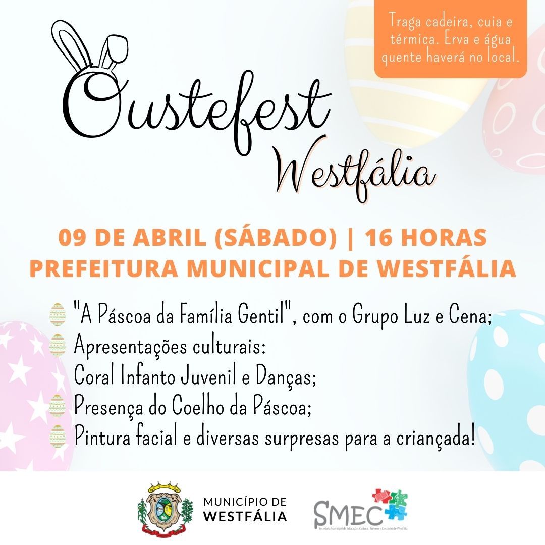 Com o objetivo de celebrar a Páscoa, a Administração Municipal de Westfália promove no próximo sábado, dia 09 de abril, a Oustefest (Festa de Páscoa, no dialeto Sapato de Pau). A programação, gratuita e preparada especialmente para as famílias westfalianas, iniciará às 16 horas, tendo por local as imediações da Prefeitura.
