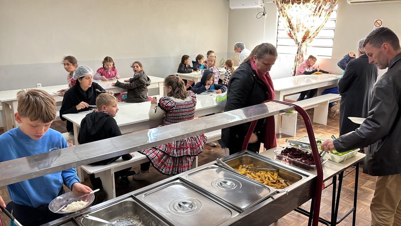 Participaram da visita o prefeito César Juliano Bloemker, a vice-prefeita Simone Landmeier e o secretário municipal de Educação, Roque Lindemann. Durante o encontro, o grupo teve a oportunidade de percorrer as instalações da escola, interagir com estudantes e servidores, e acompanhar o momento do almoço, parte importante da rotina das crianças no contraturno escolar.