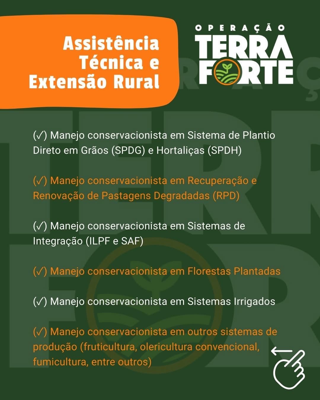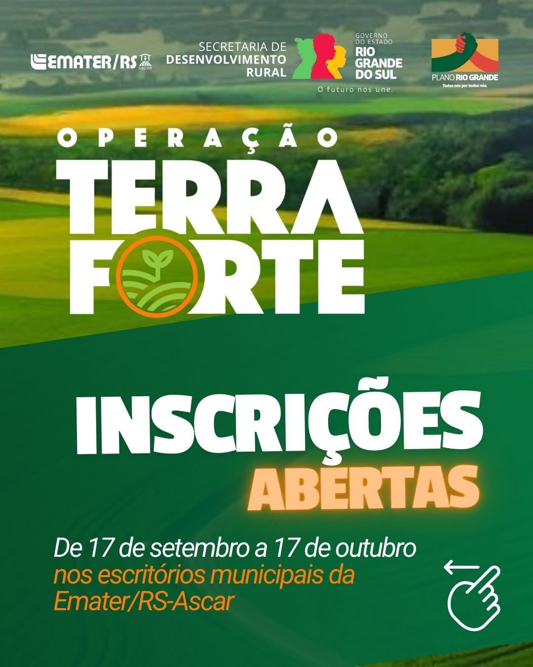 A Emater/RS-Ascar, com o apoio da Secretaria da Agricultura e Meio Ambiente de Westfália, informa que estão abertas, até o dia 17 de outubro, as inscrições para o Programa de Recuperação Socioprodutiva, Ambiental e de Resiliência Climática da Agricultura Familiar Gaúcha – Operação Terra Forte, uma iniciativa do Governo do Estado do Rio Grande do Sul, por meio da Secretaria de Desenvolvimento Rural em parceria com a Emater.