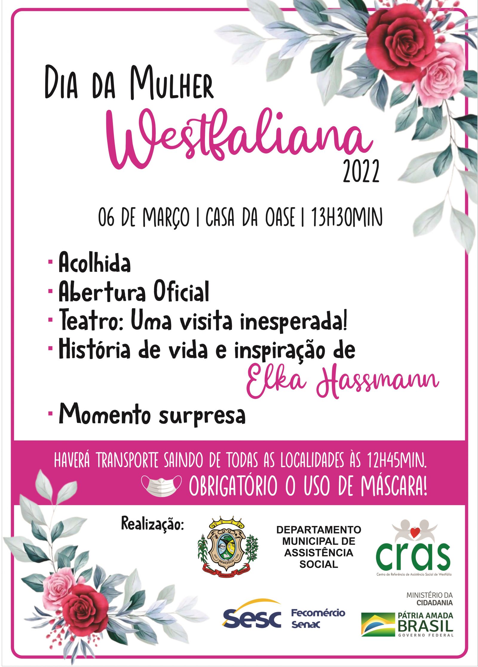 Para participar do evento, é obrigatório o uso de máscara de participação. O Dia da Mulher Westfaliana é uma realização da Administração Municipal de Westfália, por meio do DMAS e do Centro de Referência de Assistência Social (CRAS). O apoio é do Ministério da Cidadania e do SESC de Farroupilha.