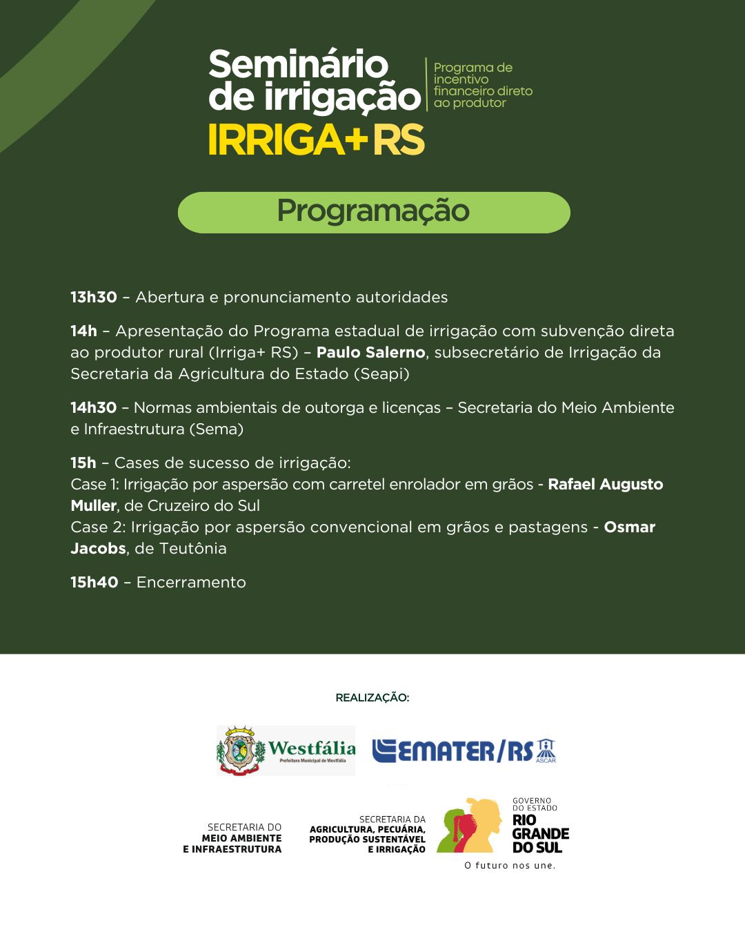 Produtores rurais e interessados em técnicas de irrigação e que buscam mais informações sobre programas públicos para implantação de áreas com irrigação têm encontro marcado no dia 04 de julho, a partir das 13h30min, no Galpão do Parque Municipal de Eventos de Westfália. Na oportunidade ocorre o Seminário de Irrigação IRRIGA+RS. O evento apresentará o programa estadual que oferece incentivo financeiro direto ao produtor, além de abordar questões ambientais e compartilhar experiências práticas de sucesso.