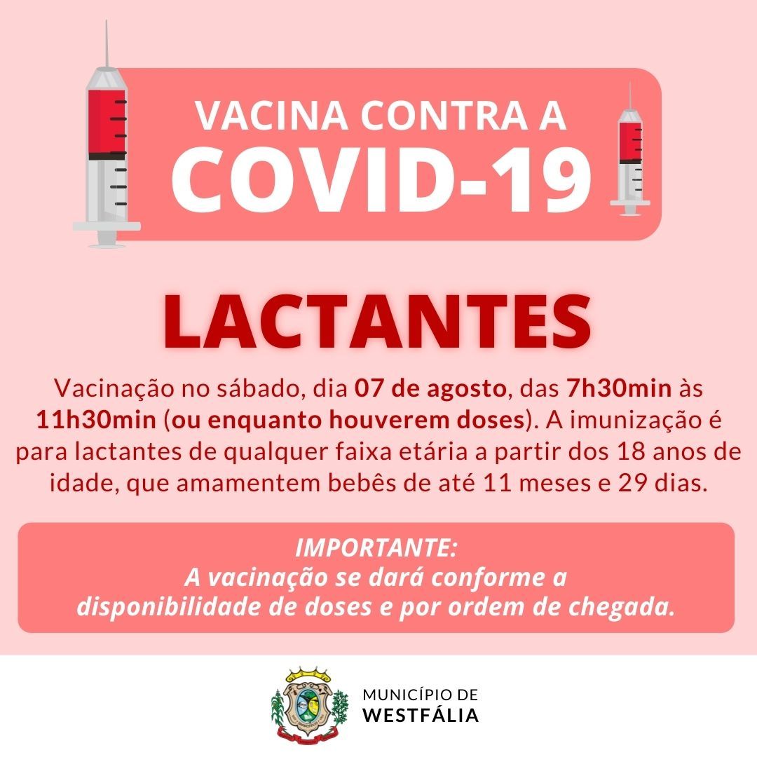 Tendo em vista promover o avanço da vacinação contra o Coronavírus (Covid-19), a Unidade Básica de Saúde (UBS) de Westfália estará aberta neste sábado, dia 07 de agosto, no turno da manhã. A imunização ocorrerá por ordem de chegada, iniciando às 7h30min e se estendendo até 11h30min ou enquanto houver a disponibilidade de vacinas.