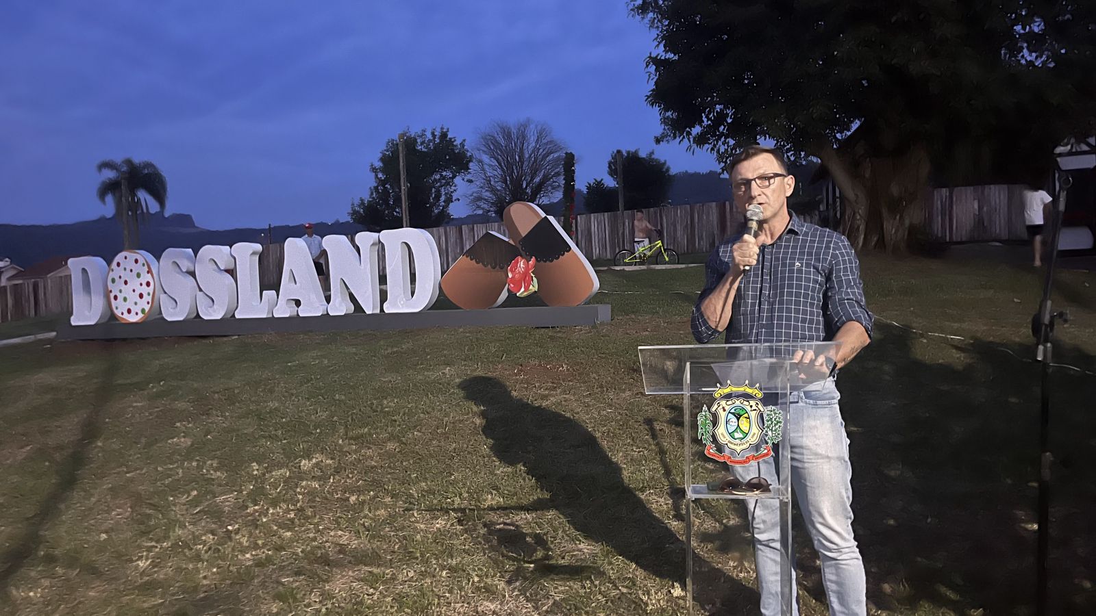 Marcando o início do ato inaugural, autoridades westfalianas realizaram o descerramento do letreiro Dossland, que complementa o cenário e encanta por meio do seu brilho e luminosidade. “Este espaço foi projetado com muito carinho e por muitas mãos. Diversas pessoas foram importantes para que a Vila Temática Dossland saísse do papel e pudesse ser entregue à nossa comunidade. De forma especial, preciso mencionar as empresas parceiras do Projeto Dossland, que vestiram a camisa e abraçaram a ideia desde o princípio”, destacou o secretário de Educação, Cultura, Turismo e Desporto, Gustavo Sieben.