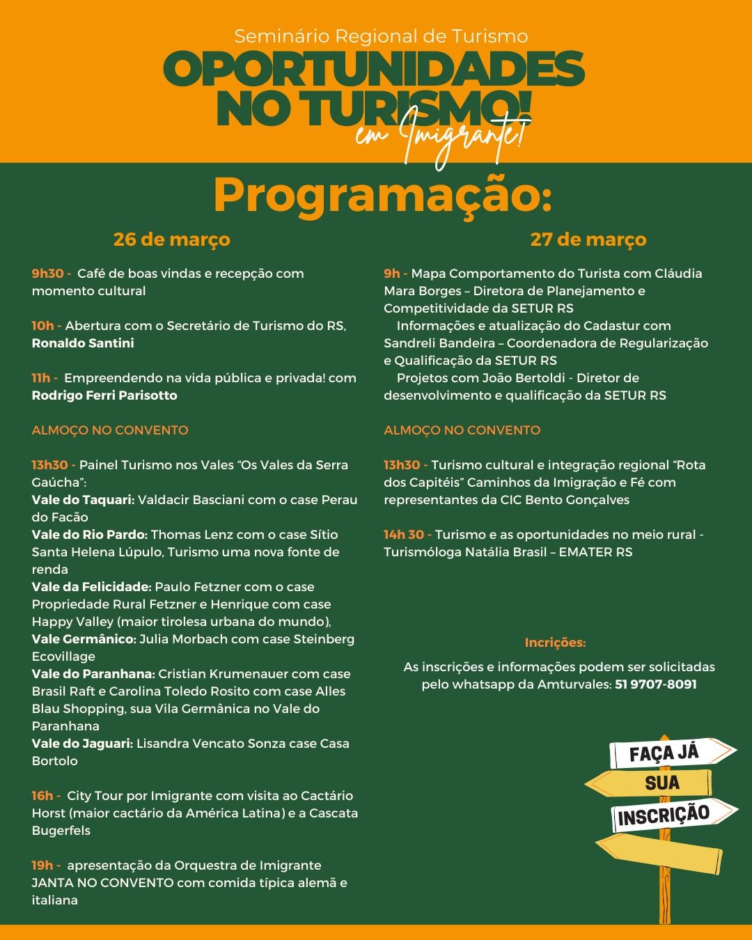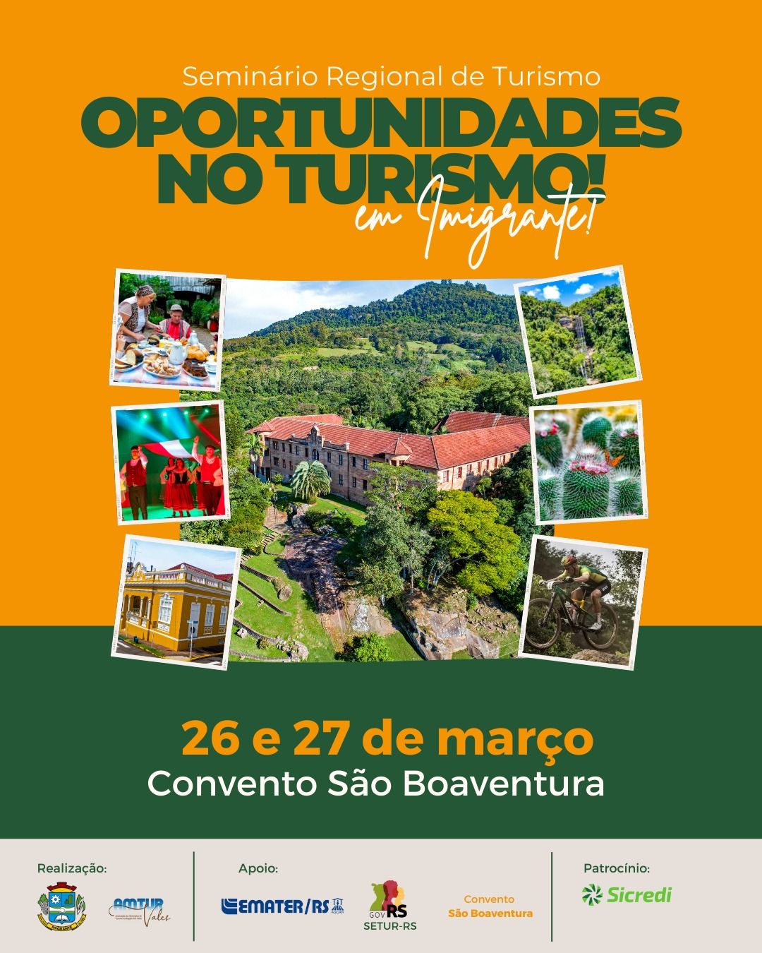 O Seminário Regional de Turismo foi uma realização da Prefeitura de Imigrante com AMTUR Vales, com apoio da Emater/RS-Ascar, Governo do Rio Grande do Sul (SETUR-RS) e Convento São Boaventura, e contou ainda com o patrocínio do Sicredi. O evento reuniu representantes de diversos municípios da região, além de especialistas e profissionais do setor turístico.
